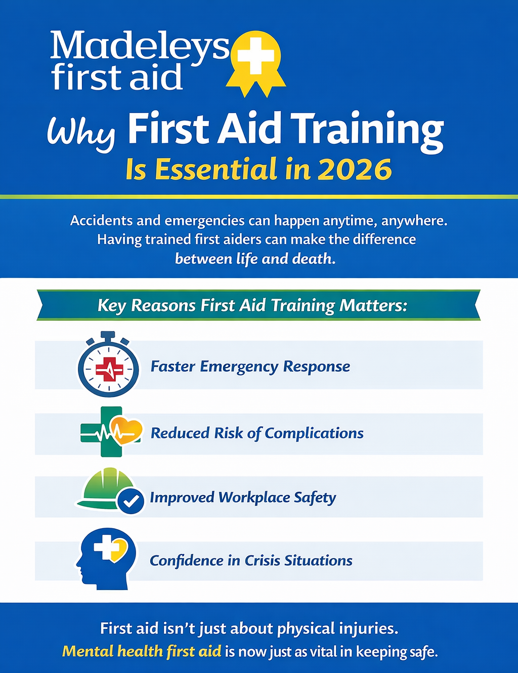 Employers across the UK also recognise that first aid is not just about physical injuries. Mental health first aid is now just as important as physical first aid when it comes to keeping people safe.